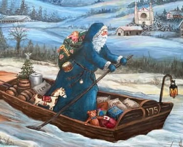 The gift bringer is in a wooden boat typically used by traders to transport their goods to villages on the shores of the Kiski river. Later, the river became so polluted it took on an orange hue however, in recent years, it has been restored to a pristine fish filled river. The boat is filled with items that would've been indicative of that early era, barrels full of root beer, coal, bags of flour and a steel, all representing industries throughout the decades. On the hillside are the original buildings, Saint Martha's Catholic Church, the home of the Leechburg founder, the original schools and homes of the steelworkers and coal miners. To the left of the painting is the facilities for mining natural gas, including the burning gas tower in the background. Leechburg was the first town where natural gas was harvested.
