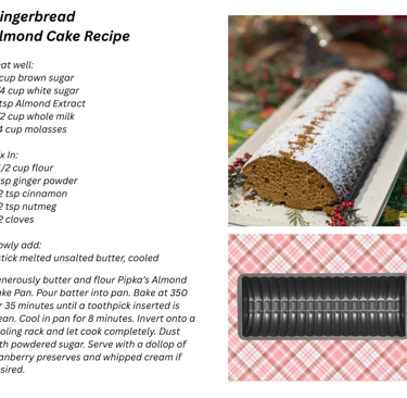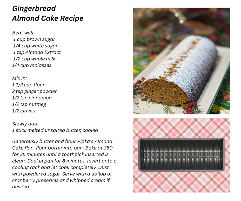 Some of you have asked if the Pipka Almond Cake, which has over 40 variations using just the one recipe, could be made into a Gingerbread cake. I thought, “Why not?”, and got busy in the kitchen. It’s the perfect time of year for gingerbread but could I make it from the original Almond Cake recipe? Yes. I had to make a couple of substitutions and add lots of spices and after I was done, the finished Gingerbread Almond Cake turned out to be a very special Christmas cake! Here’s the recipe: